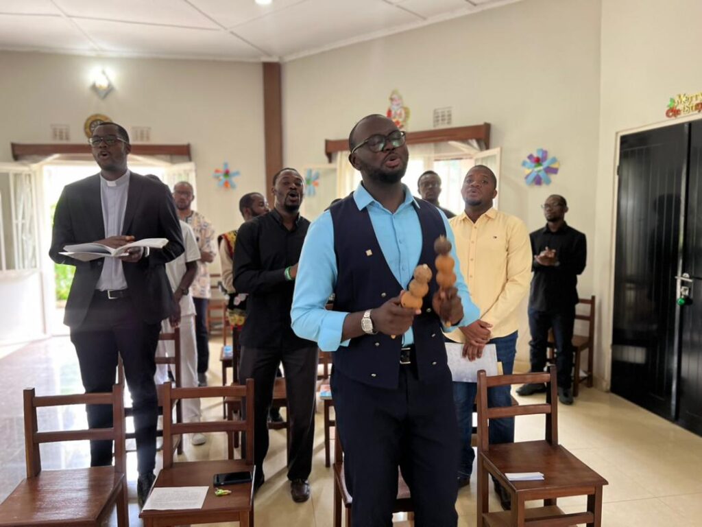 À Lubumbashi, la communauté Kwetu-Kwenu a abrité, du 21 décembre au matin du 25 décembre, les scolastiques en régence et aux études spéciales dans la ville minière, pour leur triduum de Noël. Animée par le Père Benoît Mbuyi, délégué du Provincial pour la formation, la retraite était centrée sur le mystère de l’Incarnation, avec une attention particulière portée aux figures de Joseph, Marie et de l’Enfant Jésus.